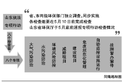 本次專項(xiàng)行動(dòng)中,省、市兩級(jí)環(huán)保部門將堅(jiān)持 立調(diào)查的方式,同步組織實(shí)施。其中,山東省環(huán)保廳派出8組檢查隊(duì)伍,分別針對(duì)大氣污染防治、水污染防治、環(huán)境風(fēng)險(xiǎn)防控等8個(gè)重點(diǎn)開展專項(xiàng)檢查。