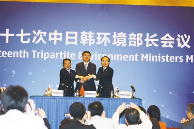 三國環境部長還 大氣環境治理、氣候變化、生物多樣性保護、沙塵暴、汞污染、海洋垃圾等全球和區域環境問題交換了意見。陳吉寧對未來三國環保合作提出三點建議: 一是凝聚發展共識,增強協調溝通,確保三國在環境合作進程中各盡其能,優勢