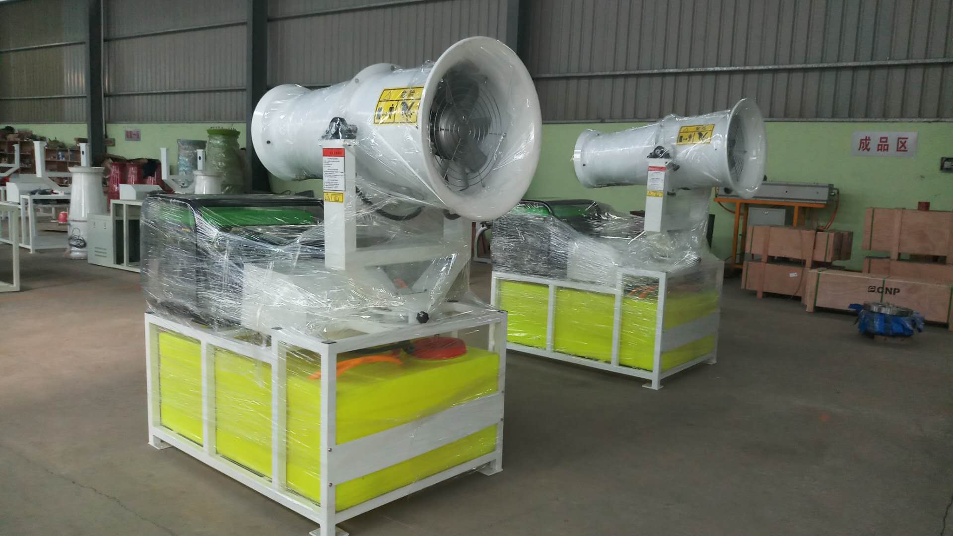 霧炮機射程遠,覆蓋面積大,它既可以用自來水也可以使用循環用水(中水),對200微米級以下粉塵具有完全抑制能力,抑沉后滿足國家對粉塵排放的標準。這種濕法抑沉主要是對料堆表面灑水增濕,利用水霧控制粉塵的擴散,其作用是增加粉塵顆粒對的粘滯性和重量來防止起沉的。
