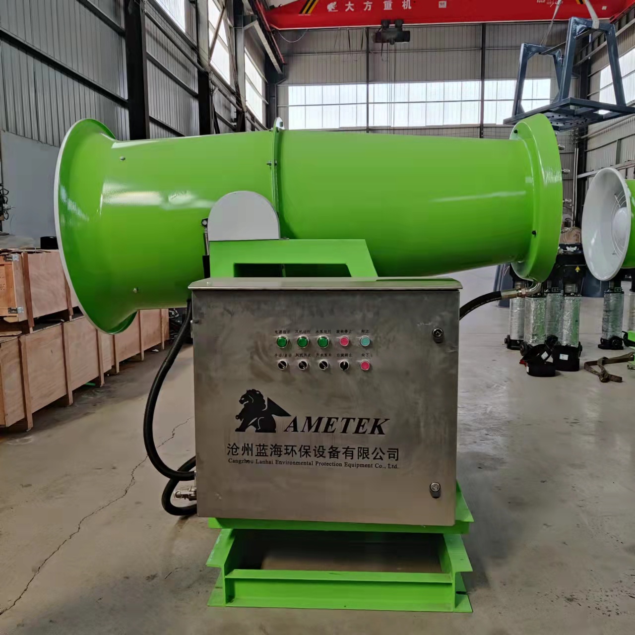 滄州藍海霧炮機廠家生產的霧炮機,根據檔位規格分3種:手動擋,半自動擋,自動擋手動的霧炮機 是噴水的炮筒噴水的時候不會移動,需要移動和噴灑方向變動的時候需要用手人工移動;半自動 是噴灑的時候可以左右平行移動噴灑; 是可以上下、左右移動噴灑;半自動和 的有遙控器。根據電機種類分為3種:鋁電機,銅電機,國標電機根據水平(無風)噴射揚程距離,分為:30米,40米,50米,60米,80米,100米等所以,滄州藍海霧炮機廠家銷售的霧炮機,分為:30米銅電機 霧炮機,30米銅電機手動霧炮機,30米銅電機半自動霧炮機,60米銅電機 霧炮機,60米銅電機半自動霧炮機等等……類似這種。其中銷售較多的規格為30米銅電機 霧炮機,60米銅電機 霧炮機等