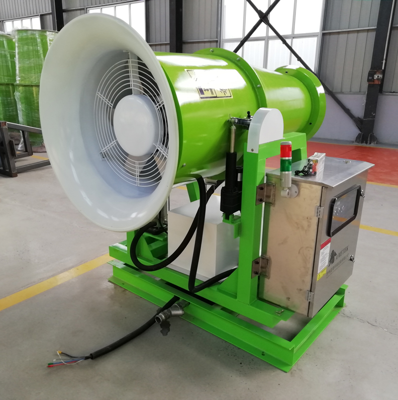 “除塵噴霧機”的原理是在液泵噴水后,利用風機將水噴灑出去,能噴灑120米遠、90米高,向天空噴灑水霧,達到抑制揚塵、綠化除塵等效果。據(jù)了解,以前工地常用高壓水槍來除塵,10噸的灑水車只能噴10分鐘左右。該“除塵噴霧機”車同樣10噸水可噴灑1個小時,且覆蓋面積超過3萬平方米。經(jīng)環(huán)保部門測試,“除塵噴霧機”可以將空氣中的PM2.5濃度降低15%到20%左右。